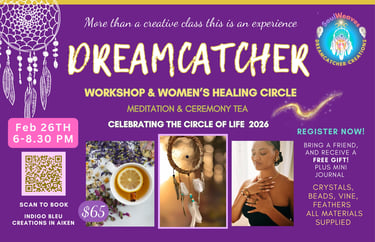 Each participant receives a Dreamcatcher “Cycle of Life” Journal Notebook — filled with inspirational messages, rituals, and creative ideas, plus space to write your own affirmations, quotes, and reflections. A beautiful keepsake to deepen your healing and continue your journey at home.